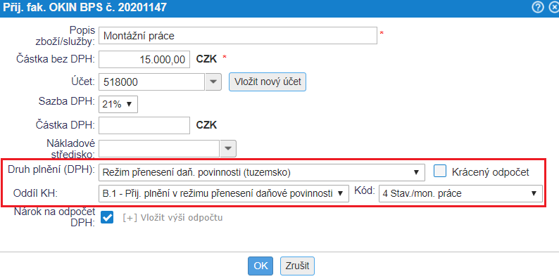 4. Kontrola všech údajů a DUZP – posledním krokem je kontrola správnosti údajů a také vyplněných datumů. Datum uskutečnění zdanitelného plnění u přijaté faktury v režimu RCH se odvíjí od zvoleného druhu plnění DPH.Data určující DUZP jsou uvedena v naší nápovědě.