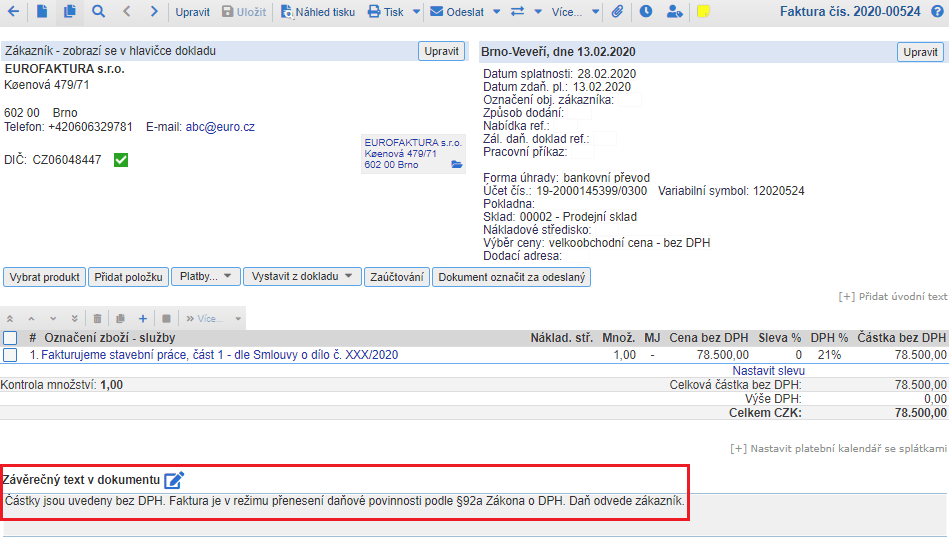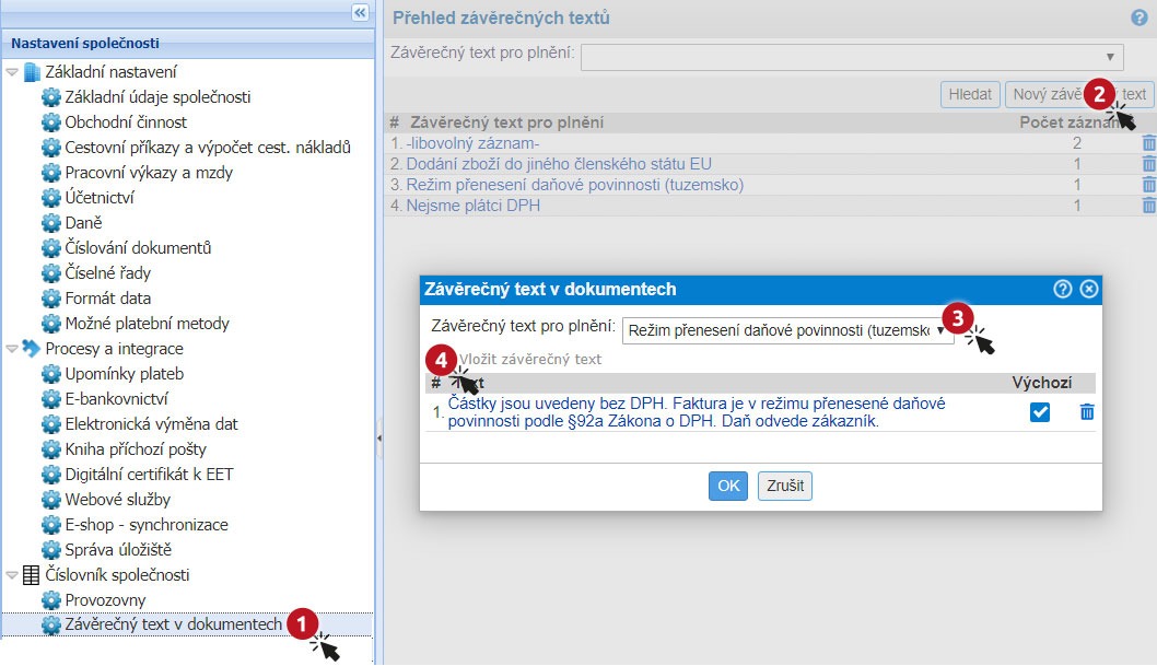 Po nastavení závěrečného textu, můžete přejít k vystavení faktury v režimu reverse charge v EU.