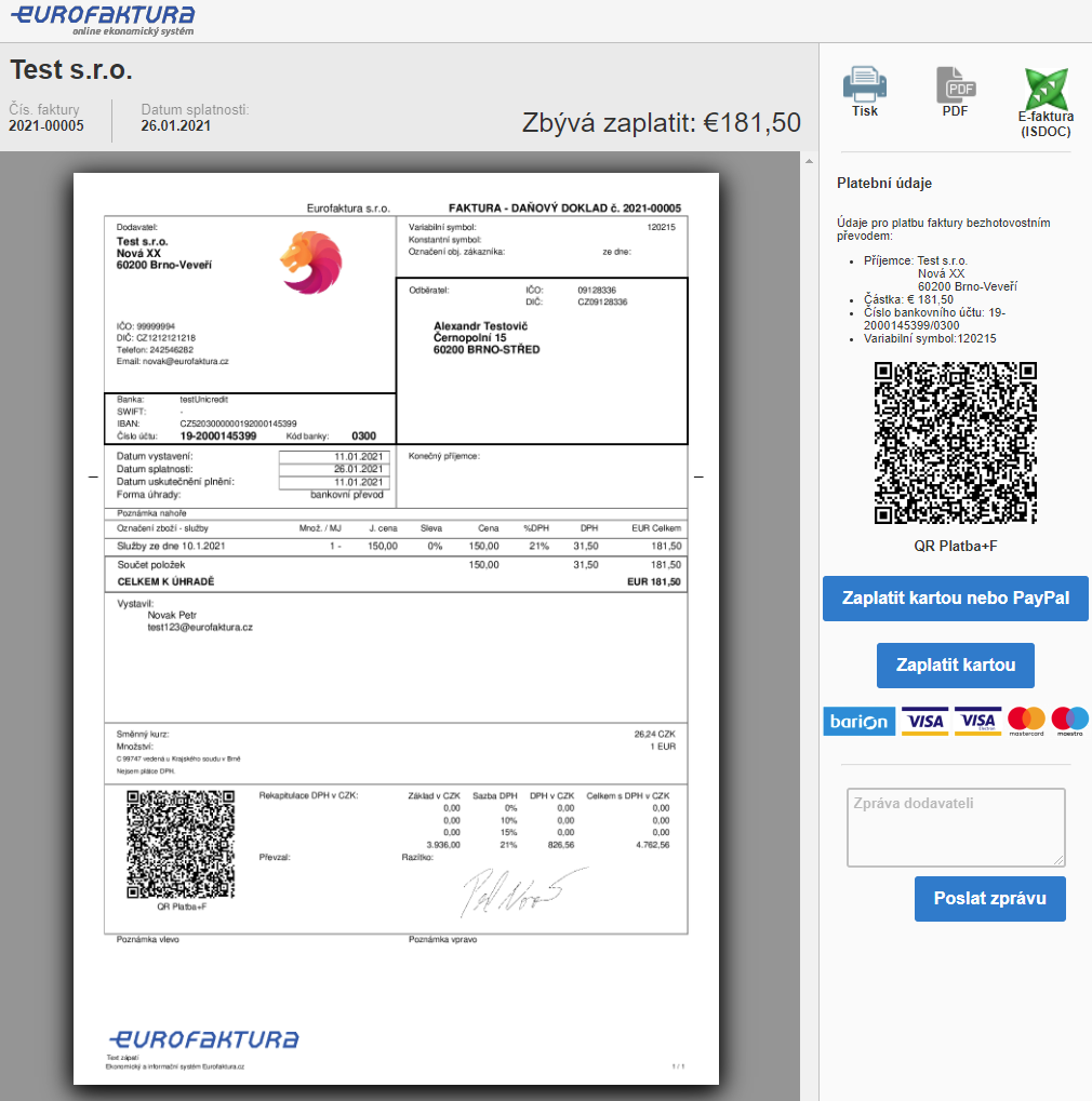 Vystavená faktura nebo jiný dokument může být z Eurofaktury odeslán SMS zprávou nebo e-mailem. V obou případech případech se zákazníkovi zobrazí jako odkaz (link). Po kliknutí na tento odkaz bude zobrazen náhled faktury, možnost jejího stažení nebo právě online platba kartou.