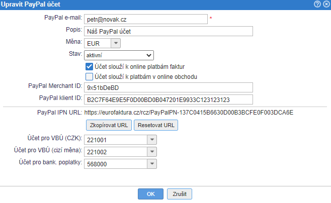 Při výběru PayPal platební brány bude nastavení účtu vypadat následovně: