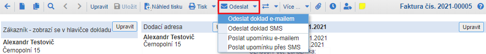 Po nastavení textu e-mailu a bankovního účtu můžete přistoupit k vystavení a odeslání faktury zákazníkovi. Základní kroky vystavení faktury si můžete připomenout v jednom z předchozích článku – zde. Jakmile máte fakturu vystavenou, v panelu nástrojů klikněte na Odeslat.