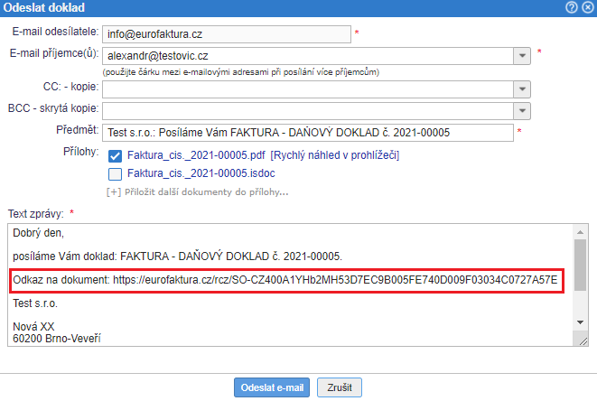 E-mail příjemce zde bude předvyplněn (pokud jej máte uložen v detailu partnera – Adresář – Zákazníci) nebo jej vložte ručně. Součástí odeslaného e-mailu bude i odkaz na dokument, kde místo symbolu $DOC_URL$ bude již platný odkaz na konkrétní fakturu.