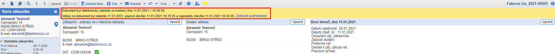 Jakmile zákazník otevře dokument z odkazu, program vás o tom informuje ve žlutém stavovém řádku na detailu faktury. Dále jsou zde zaznamenány změny s dokumentem z odkazu – kdy ho zákazník poprvé/naposledy otevřel a další.