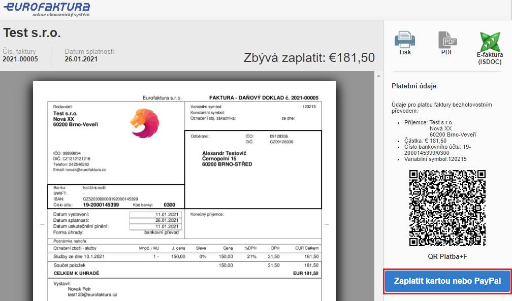Po otevření odkazu s fakturou se objeví náhled faktury a při správném nastavení bankovního účtu také možnosti pro online zaplacení. Pro zaplacení stačí kliknout na tlačítko Zaplatit kartou nebo PayPal (v případě využití platební brány PayPal), po potvrzení této volby budete přesměrováni na platební bránu.