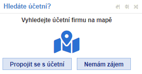 1. Po přihlášení do Vašeho Eurofaktura účtu uvidíte ihned na úvodní stránce tento widget s názvem Hledáte účetní? (viz níže). Na mapě účetních můžete zjistit, jestli je některý účetní poblíž Vaší firmě (pokud potřebujete občasný osobní kontakt). Nebo si zkrátka vyberte z nabídky.