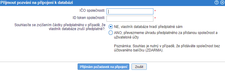 Po vyplnění IČO společnosti a ID tokenu vyberte způsob hrazení předplatného. Nakonec je nutné potvrdit přesun databáze ze strany klienta i účetní.